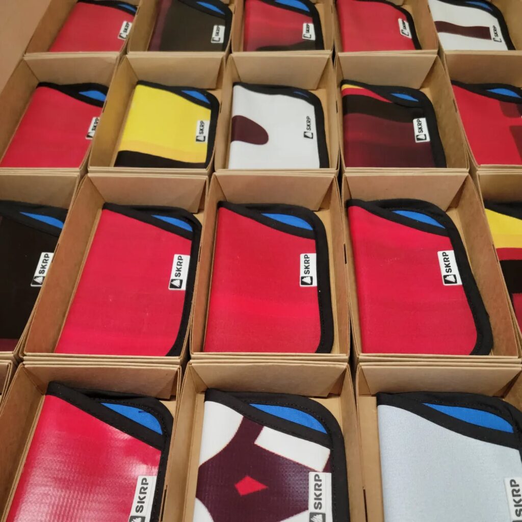 Our signature pouch made from vibrant Canadian billboard material with soft deadstock fabric lining